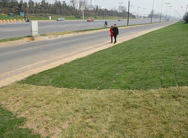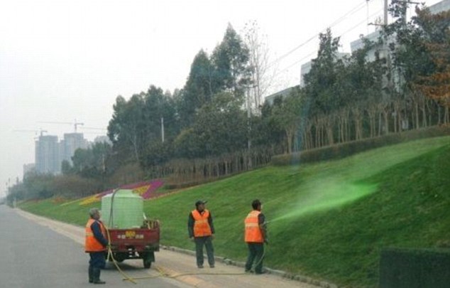 Κινέζοι δημοσιογράφοι κατέγραψαν συνεργεία να ρίχνουν μια ειδική πράσινη μπογιά στο χορτάρι, γράφει η Telegraph.